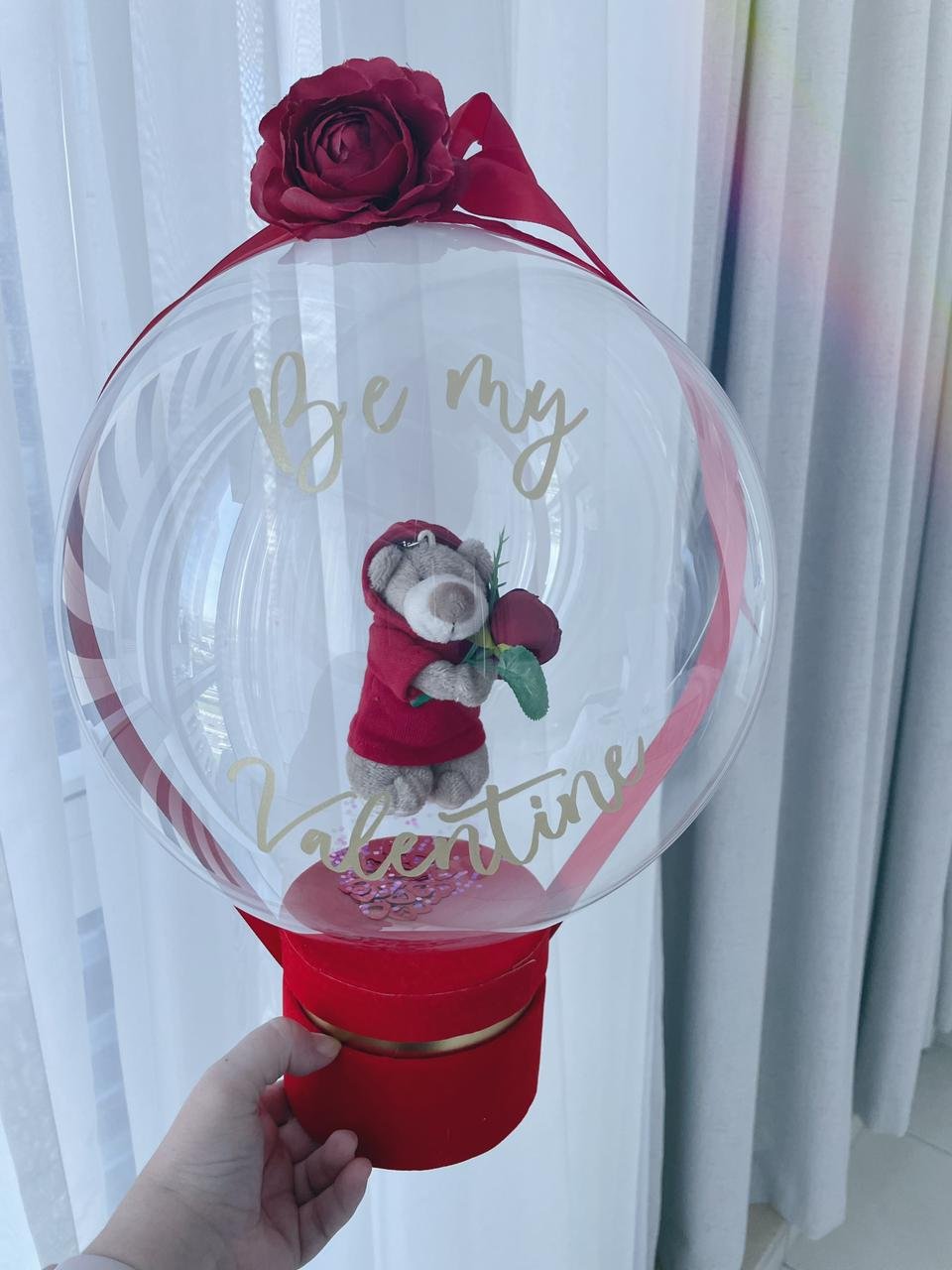 Spoil your Love with this cute teddy keychain which is holding a rose in a transparent bubble balloon with a message be my valentine. The red velvet box contains 7 pcs of Rafaello chocolates.