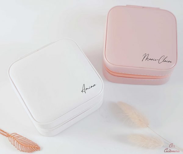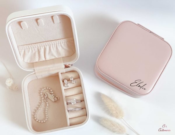 PU Leather Small Jewelry Box, Travel Portable Jewelry Case for Ring, Pendant, Earring, Necklace, Bracelet Organizer Storage Holder Boxes (Pink , White) Looking for the perfect small jewelry box to take on your travels? This PU leather case is just what you need! It’s spacious enough to store your rings, pendants, and earrings but compact enough to fit in your bag. Plus, the beautiful finishes and soft touch give it a luxury feel. Personalize it with your name, initials, or rhinestone letter for a delicate touch. This Personalized jewelry box is a perfect gift for any occasion. This delicate Small Jewelry Box 10 x 10 cm is perfect for organizing and storing your jewelry while you’re on the go. The deluxe synthetic PU leather exterior protects your jewelry from scratches, while the high-quality flannel interior prevents tangles and snags. The small size is perfect for carrying in your purse or suitcase, and the colors is sure to please. Whether you’re looking for a place to store your wedding ring when you travel or a safe place to keep your favorite necklace, this Small Jewelry Box is the perfect solution. Order yours today! This PU leather jewelry box is perfect for you! Its travel size is 3.9*3.9*inch/10*10*cm, so it is portable, lightweight, and easy to carry in your handbags or your luggage. The stylish design makes it an excellent gift for any occasion! There are also two compartments inside, so you can organize your jewelry however you like. The soft PU leather material protects your jewelry from scratches and damage. Order this cute and practical jewelry box today! You will love it! This jewelry box is perfect for anyone who likes to travel with their jewelry or keep their jewelry organized at home. The simple and compact design is ideal for storing rings, pendants, earrings, necklaces, and bracelets. The two removable dividers make it easy to customize the box to meet your needs. The elegant pink and snow white color makes this box a great gift for your bridesmaids, mother of the bride, birthdays, valentines, Christmas . The box has a sleek and stylish design and is available in various colors to suit your preference. The box’s interior is lined with soft velvet fabric, which helps prevent your jewelry from being scratched or damaged. The box has multiple different sizes compartments, making it easy to store all of your jewelry in one place. The lid of the box has little hangers and a pocket to store your necklaces without them getting tangled. This trendy jewelry box is ideal for any woman who loves to accessorize! The sleek PU leather exterior and soft velvet interior create a luxurious look and feel, while the sturdy construction ensures that your jewelry will be safe and sound. The box has multiple compartments of different sizes, so you can easily organize your rings, necklaces, pendants, earrings, and bracelets. And the compact design makes it easy to take with you on the go – perfect for travel or everyday use. Whether you’re looking for a unique gift or a stylish way to keep your jewelry collection organized, this box is sure to please. The PU Leather Small Jewelry Box is perfect if you are looking for a small, easy-to-carry jewelry box. It has a lot of compartments and pocket to store different types of jewelry. The colors makes it feminine and stylish. This would make an excellent gift for any woman in your life. Personalization options: Printing: Rhinestone Letter ( silver) 5 x 5 cm approx Printing color : size 4 x 2 cm Gold Glitter Rose gold Glitter Silver Glitter Gold metallic Rose Gold metallic