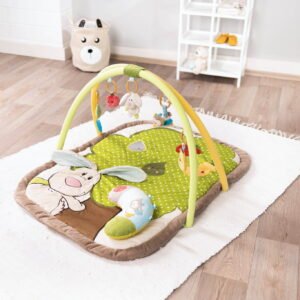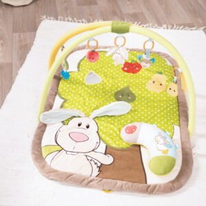 Our cuddly soft playmat is adorned with whimsical 3-D bunny ears, providing endless amusement and playtime joy for your little explorer. But that’s not all – hidden surprises abound! Uncover the secrets within as your baby discovers rustling paper, a gentle bell that tinkles with every touch, a reflective mirror to spark curiosity, a soothing rattle, and a teething ring for those emerging little teeth. These engaging elements enhance your baby’s tactile and auditory senses, awakening their innate inquisitiveness.
