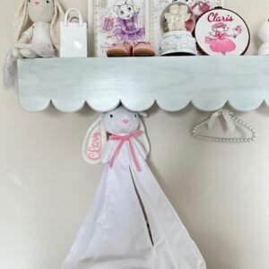 The storage unit is available in three charming designs: Bunny, Bear, and Elephant. Each design features a cute animal head with a tent-shaped body, adding a playful touch to your nursery decor. The personalized velvet print, included in the price, allows you to add your baby’s name, making it a unique and special gift.