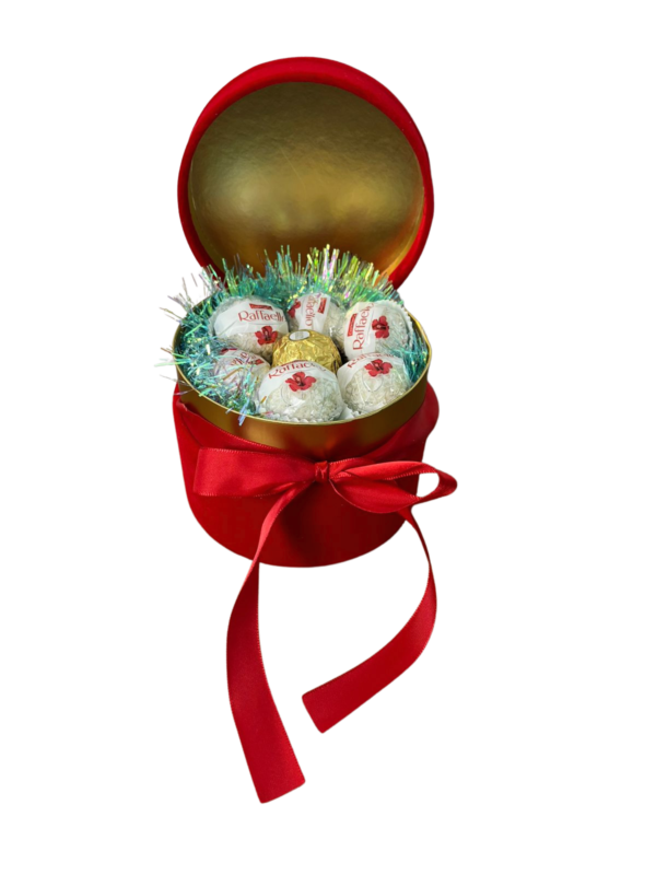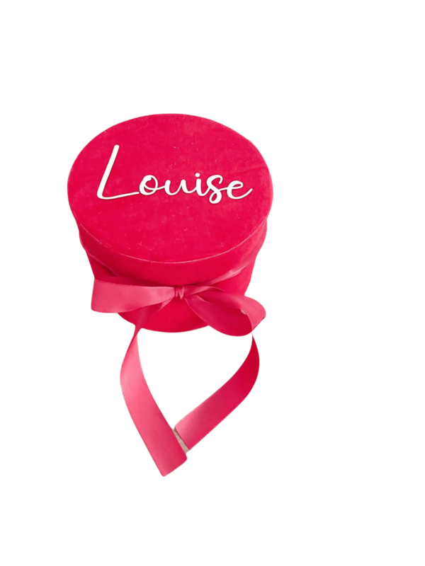 This christmas chocolate box a beautiful velvet box personalised with name on the lid. It is reusable. it contains 7 chocolate  candy ( , Raffaello, ferrero rocher)nested on a beautiful sparkly tinsel. it is a perfect as a gift for any chocolate lover , a friend or a family member. Personalise the velvet box with name and it will be perfect  little storage container to be used after christmas too. The diameter of the box 12 cm.The size of the printing is about 9 x 5 cm , it can vary depending on the length of the name.